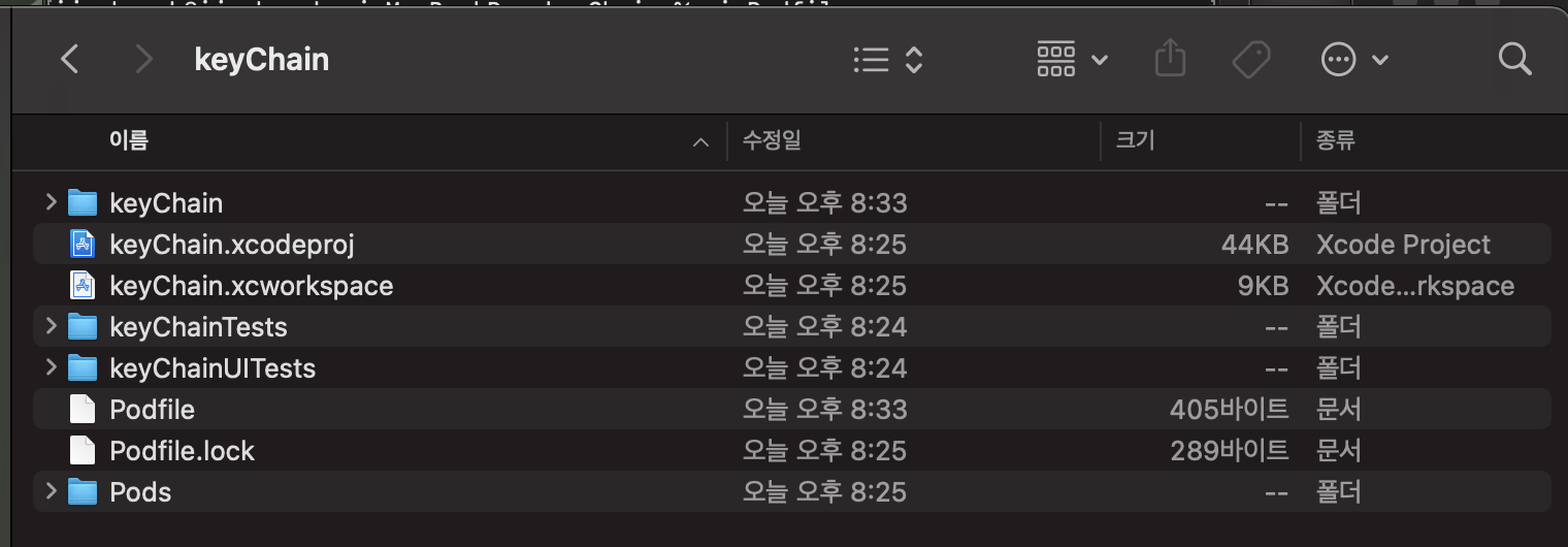 2. 그리고 프로젝트 파일 가면 원래 없던 xcworkspace 파일이 생겼는데 저걸로 실행해주세요.