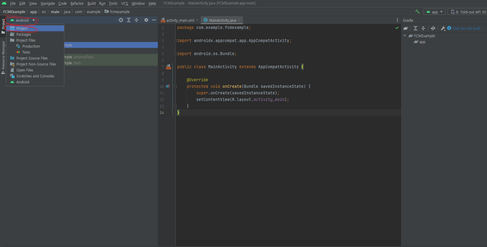 14. 그리고 다시 Project로 바꾼걸 Android 로 변경한 뒤, 좌측 탭 Gradle 에서 Project로 되어있는 파일을 열어서