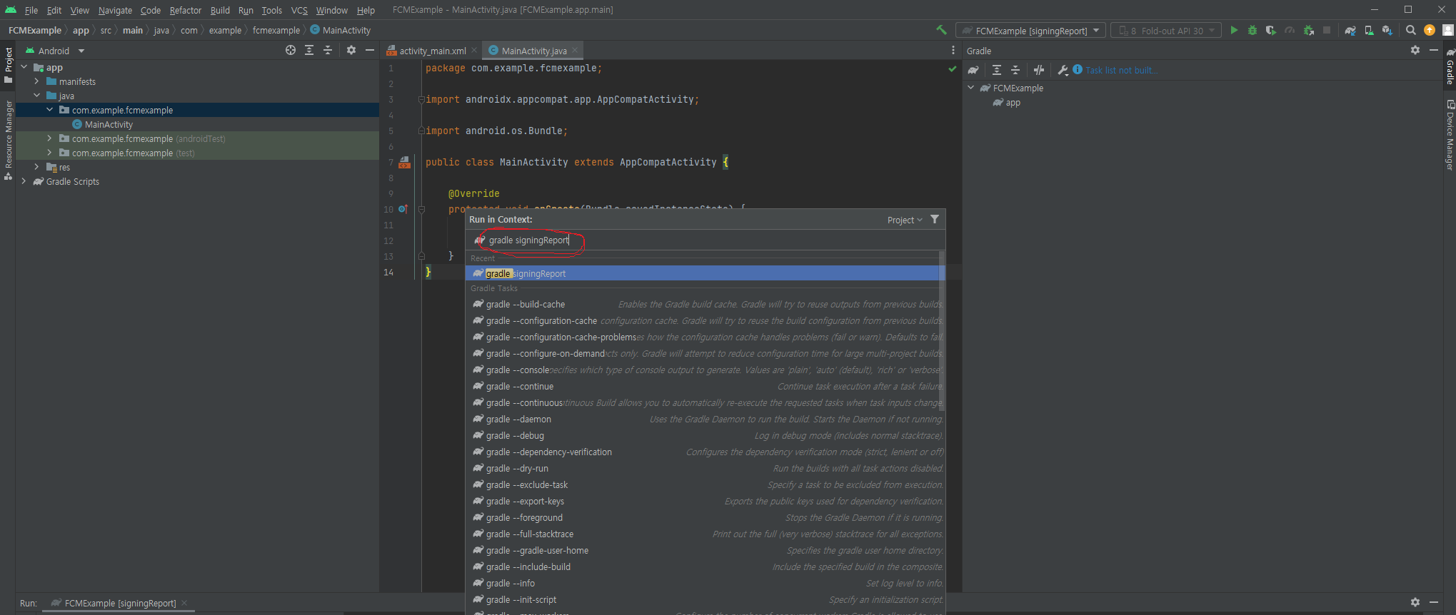 9. 그리고 입력창에 signingReport 을 입력해주세요 (gradle 은 기본 입력 되어있습니다.)