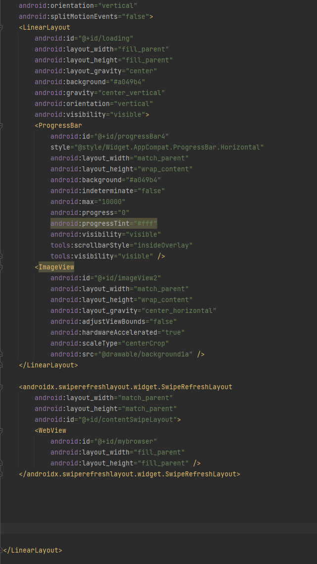 4. <WebView> 부분을 <androidx.swiperefreshlayout.widget.SwipeRefreshLayout 으로 감싸줍니다.