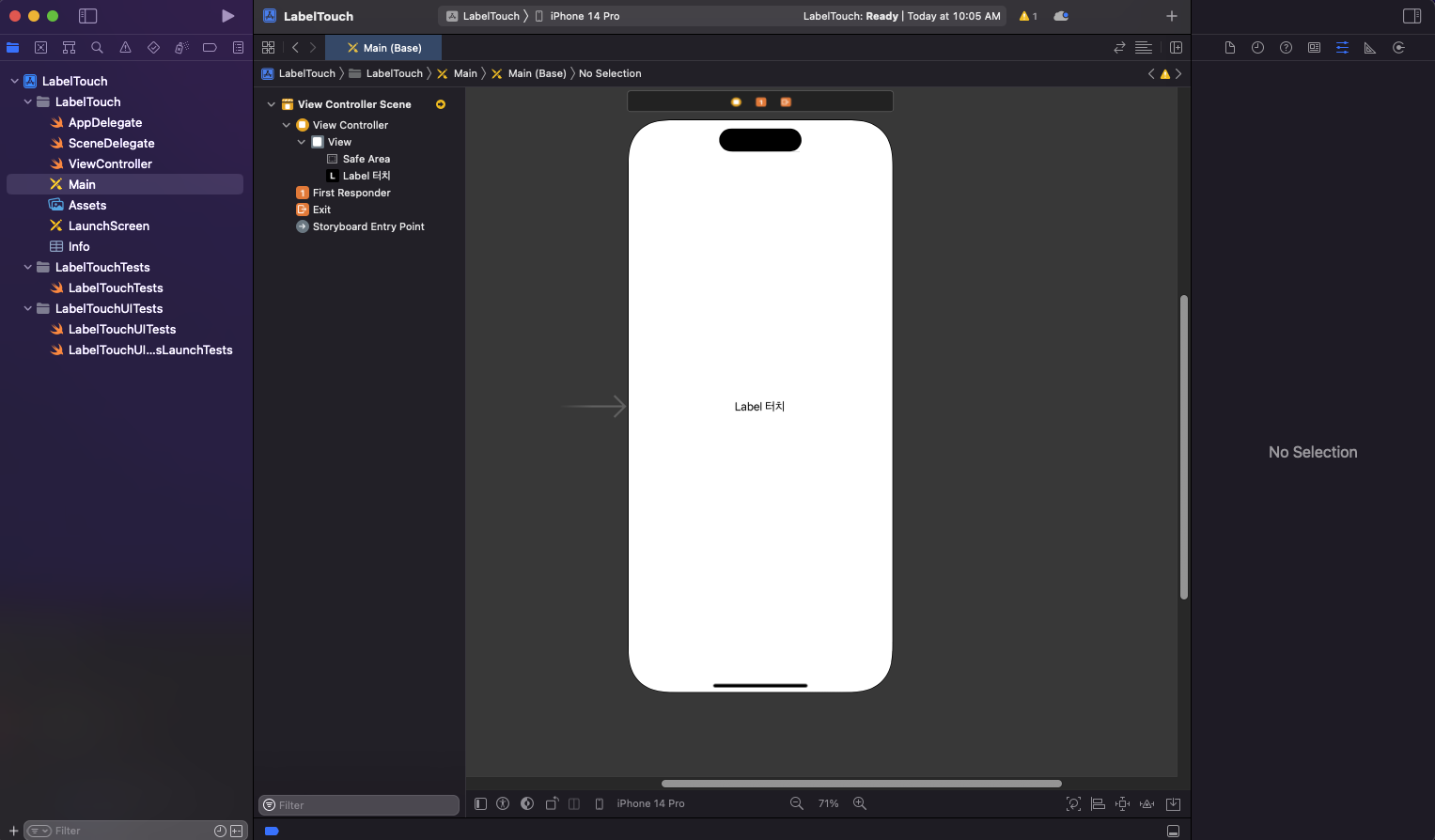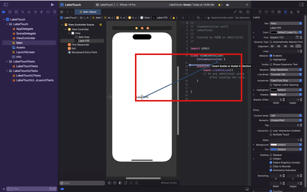 3. 그리고 생성한 라벨을 우클릭 누른상태에서 뷰컨트롤러에 이어줍니다.