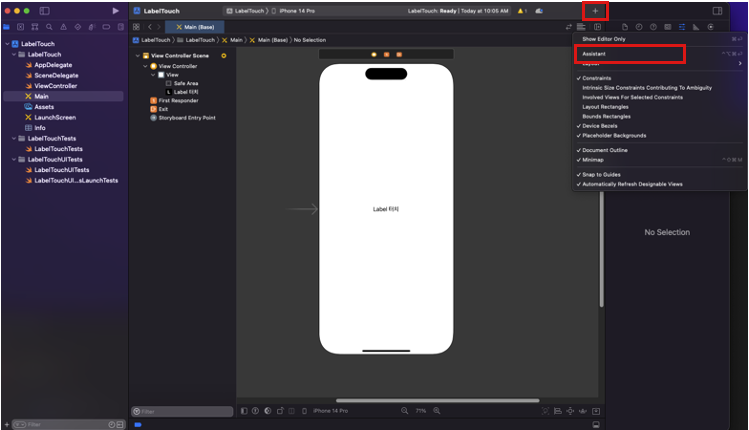 2.스토리보드와 뷰컨트롤러를 함께 보기위해 + 버튼 , Assistant 를 차례로 눌러주세요