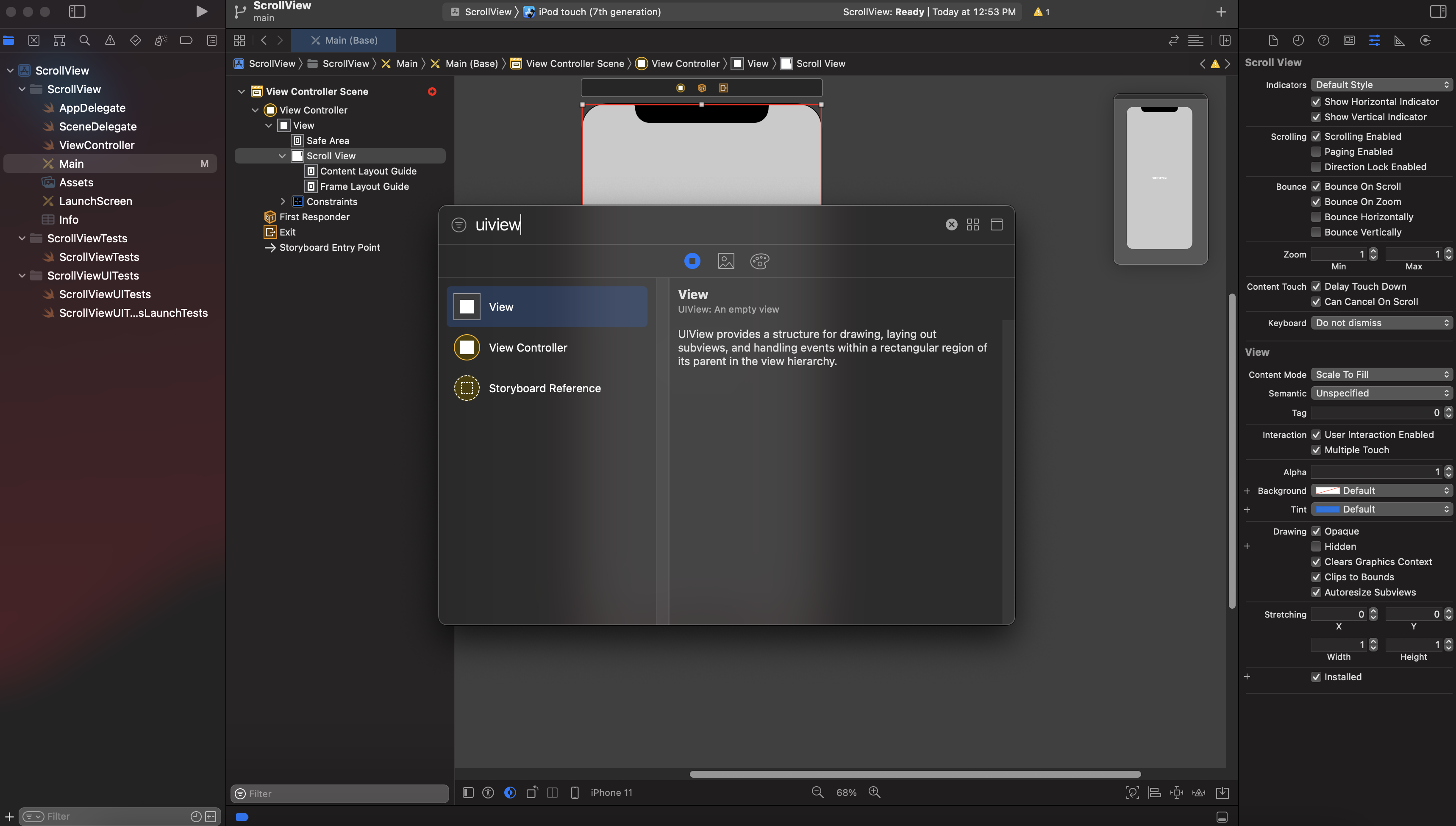 5.그리고 스크롤뷰 위에 View하나를 생성해줍니다.