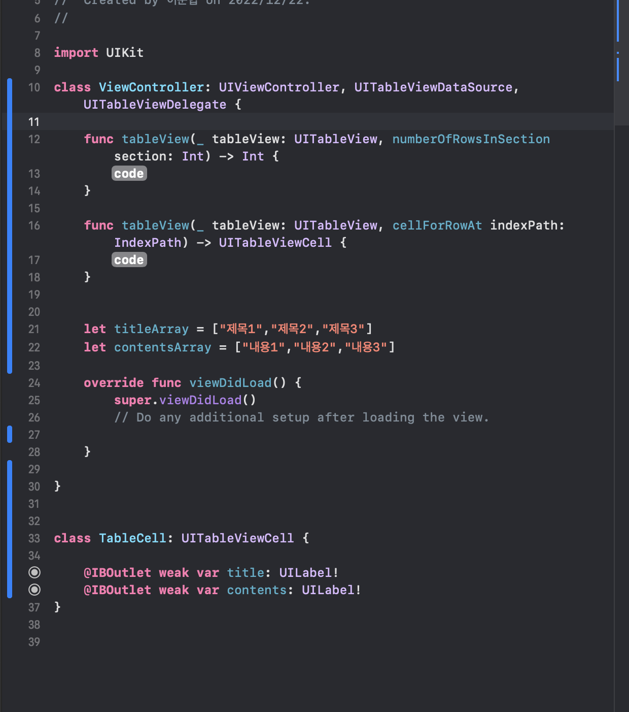 10. 자 다시 돌아와서 viewController에 UITableViewDataSource와 UITableViewDelegate 프로토콜을 채택해줍니다.