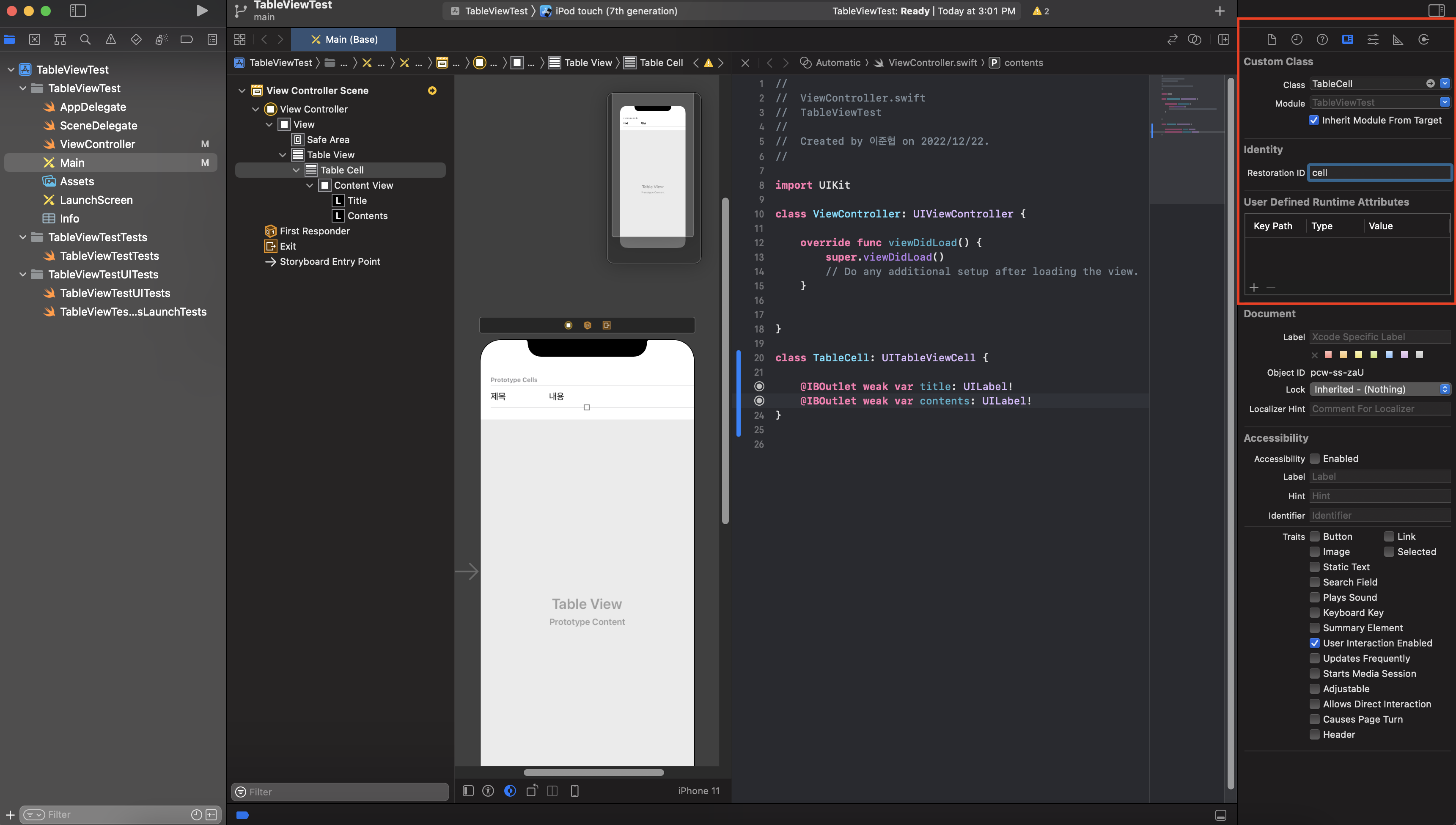 7. TableCell 을 활성화 시킨 상태에서 인스팩터창 class 이름을 방금 생성한 TableCell 로 연결시켜 줍니다.