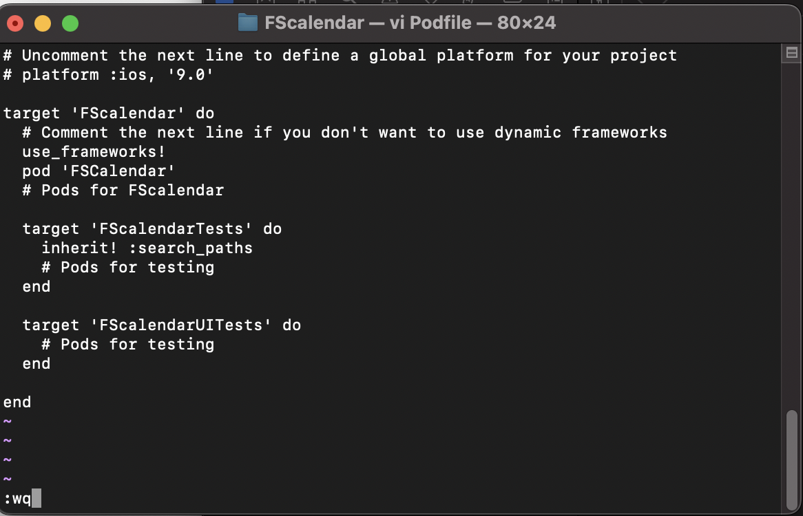 vi Podfile 들어오셔서 i 누르시면 인서트 모드로 변경되는데