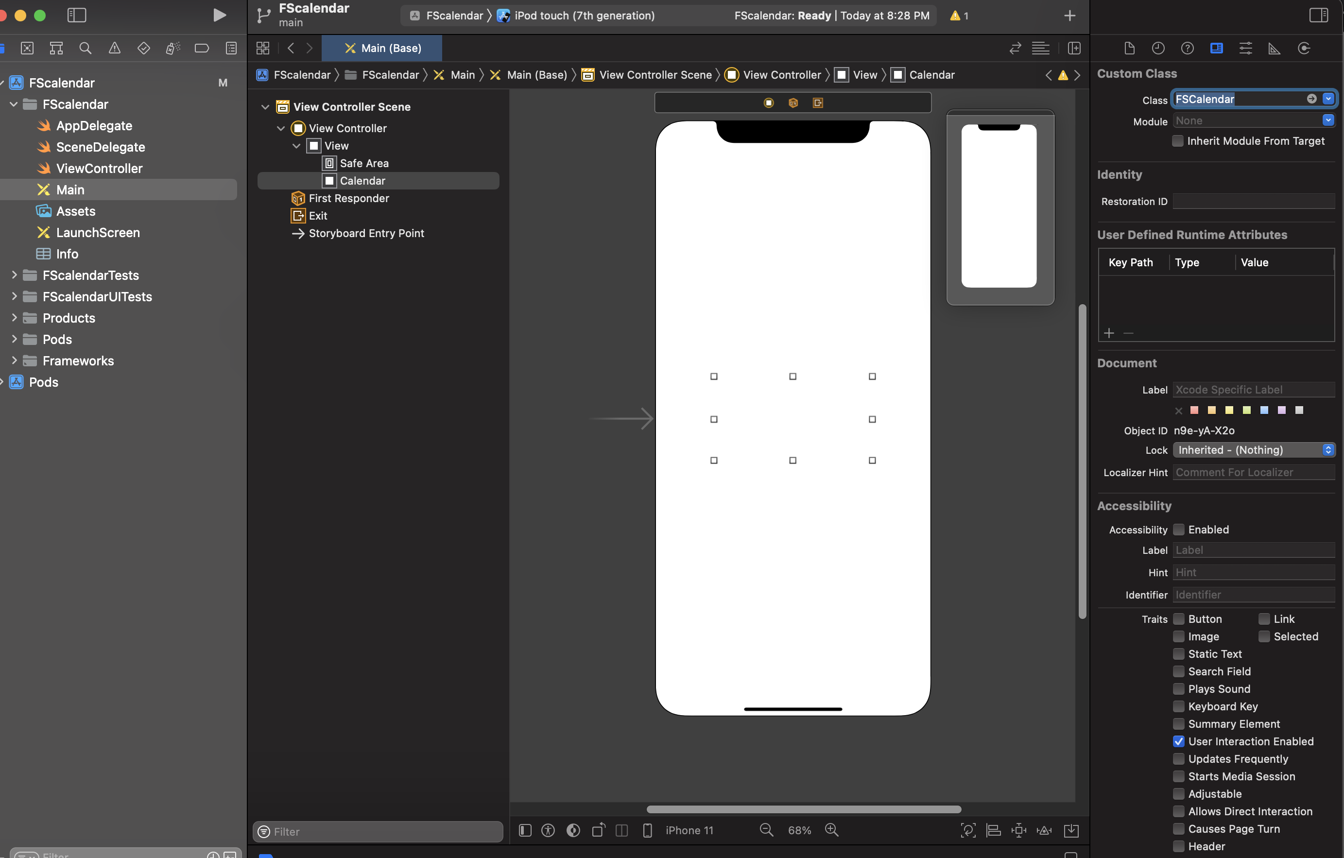 그리고 우측 Custom Class 에서 Class 이름을 FSCalendar 로 변경해주시면 끝입니다.