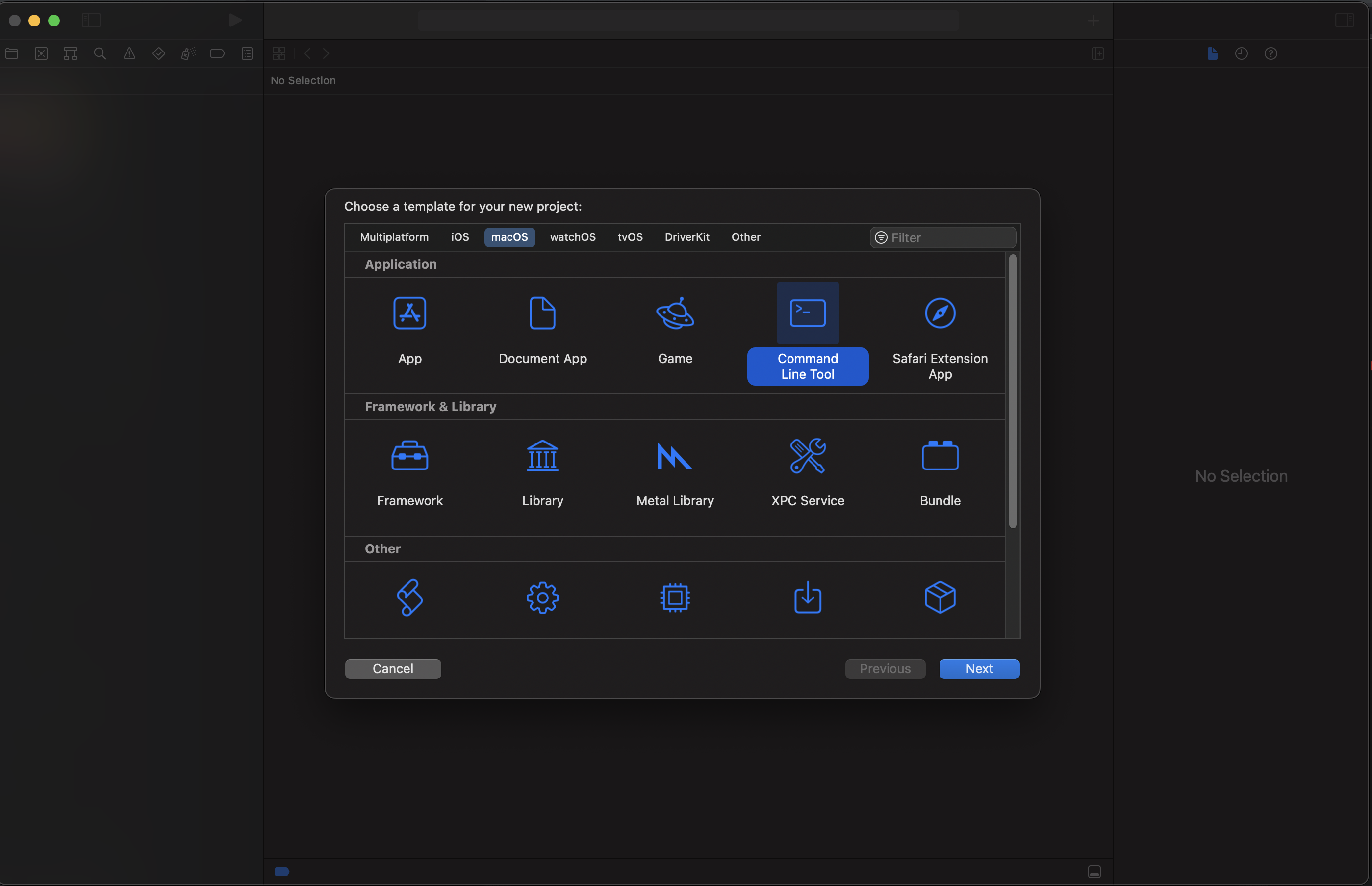 아래와 같이 macOs -> Command Line Tool 로 프로젝트 생성해서 진행하셔야 합니다.
